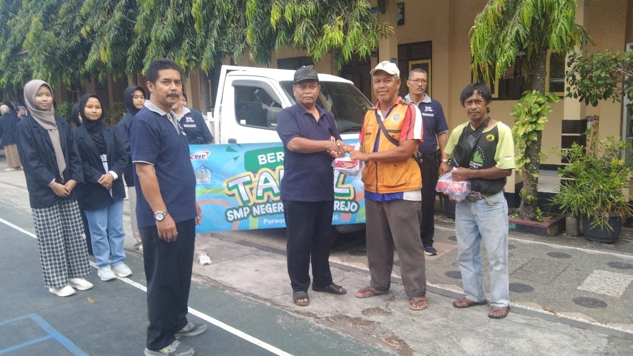 Simbolis penyerahan Takjil kepada masyarakat yang dilakukan Kepala SMPN 4 Purworejo, Teguh Prayitno, S.Pd., M.M.Pd. - foto: Koranjuri.com